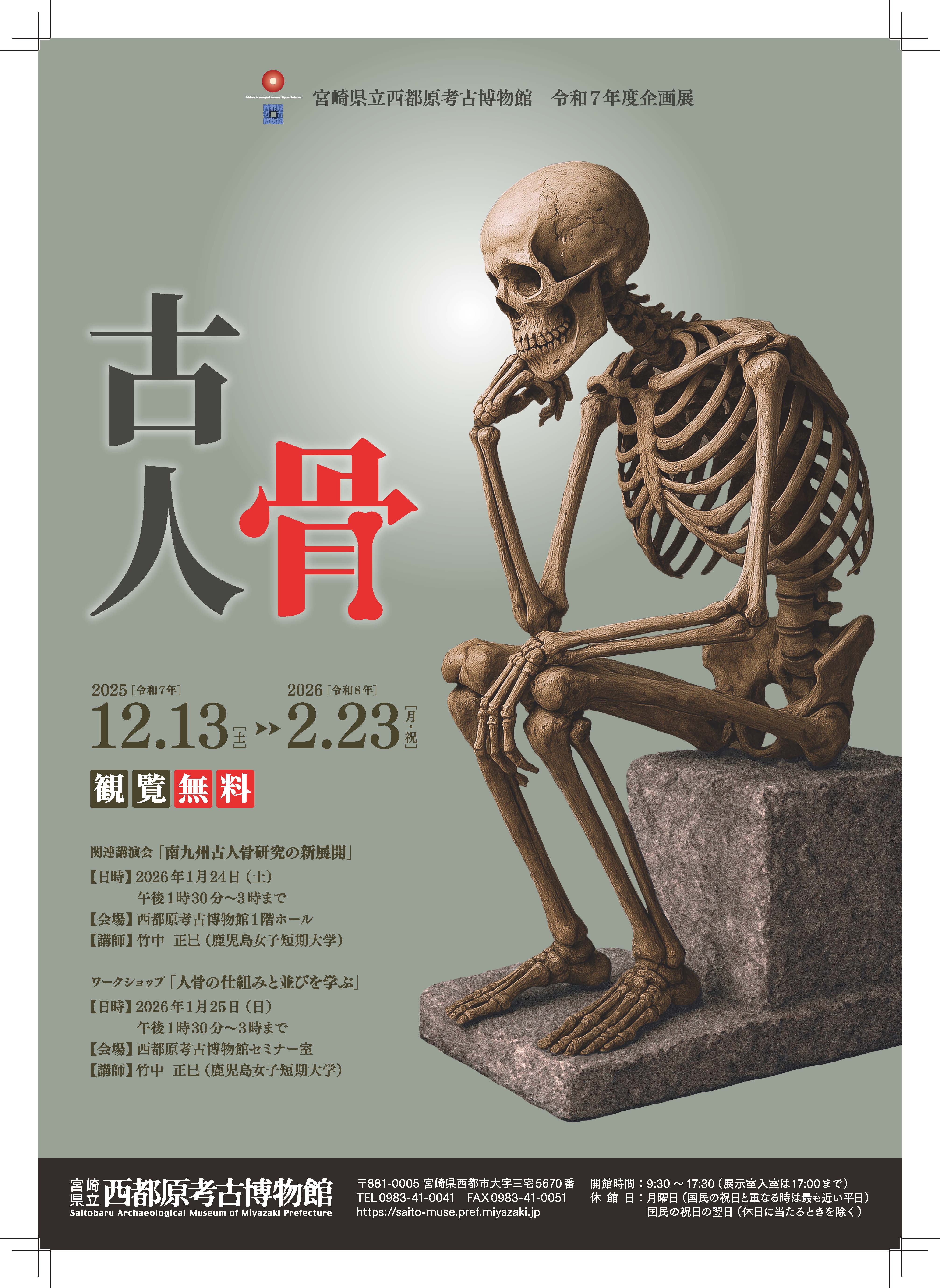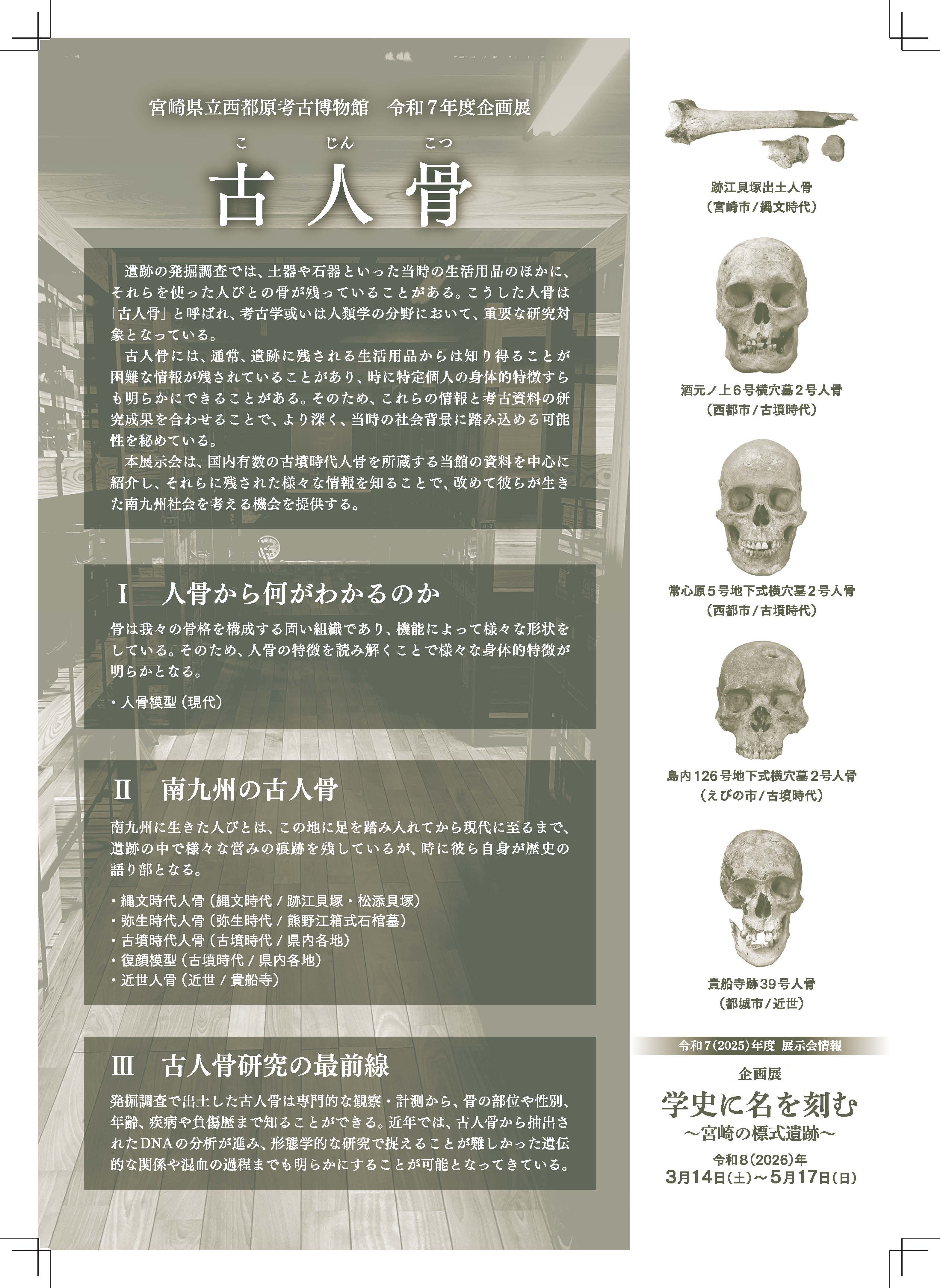 西都原考古博物館では、企画展「古人骨」(こじんこつ)を以下のとおり開催します。本展示会では、国内有数の古墳時代人骨を所蔵する当館の厳選された資料を紹介します。