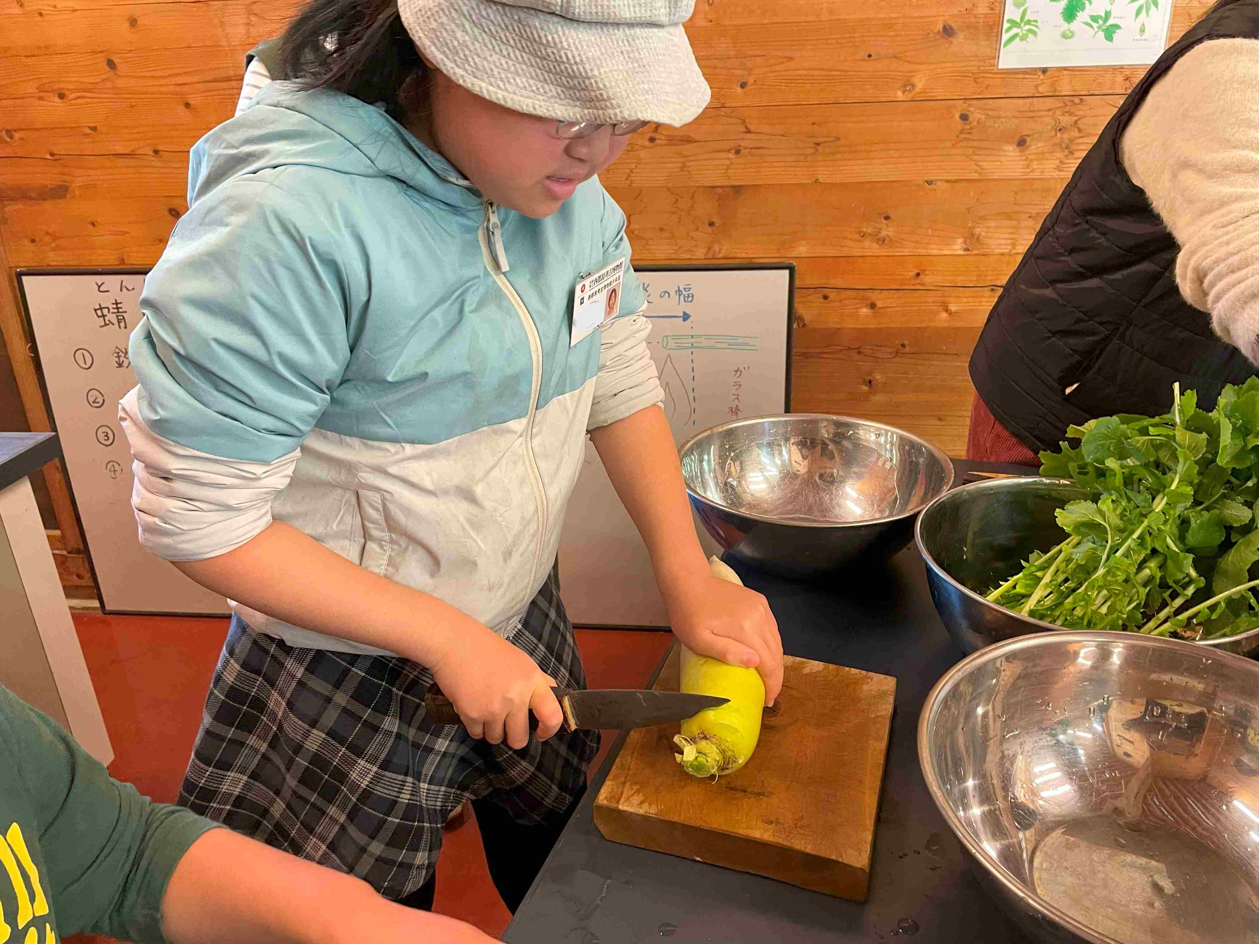 子どもたちは、火起こしや薪運び、食材のカット、餅付き、ドングリ潰しなどに協力しながら取り組み、お昼は自分たちで作った古代食を食べました。