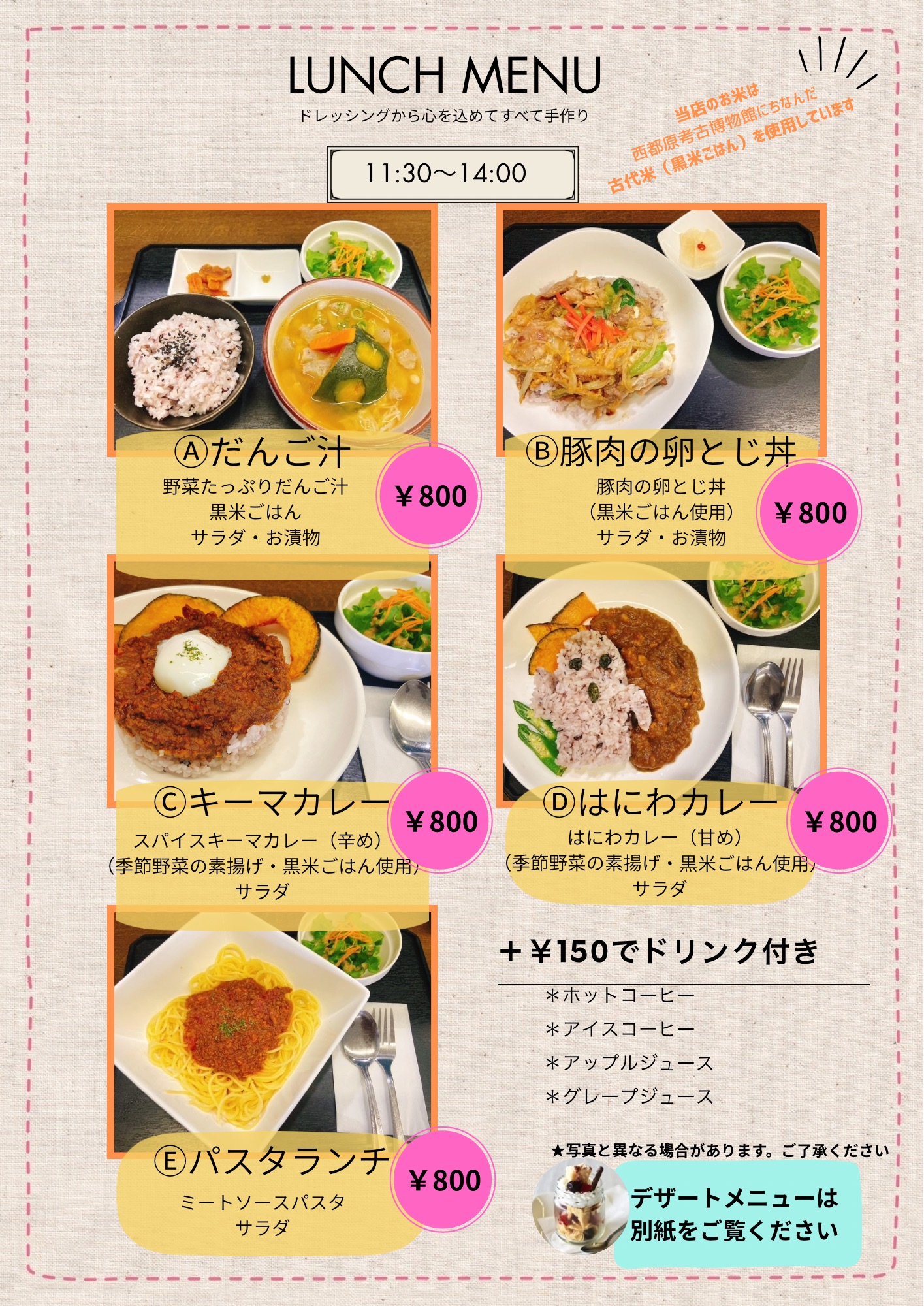 5種類のランチメニュー(税込800円)、その他いろいろとございます。 ランチタイム 11:30~14:00